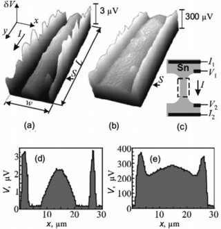 Візуалізація резистивного стану широкої надпровідної плівки олова в нульовому магнітному полі за допомогою НТЛСМ. Тривимірна карта вольтової реакції δV («гірський ландшафт») прямокутної робочої частини зразка при транспортному струмі (a) I ≈ Ic, I > Ic та (b) I >> Ic. Ширина області сканування w = 30мкм, довжина L = 100мкм. Стрілки вказують напрямок транспортного струму (I) та вибрані ділянки (S) для одновимірних розподілів реакції по плівці (d), (e). Продемонстровано конфігурацію зразка плівки (c) зі струмопідводами та потенціалпідводами; пунктирна лінія обмежує зону сканування.