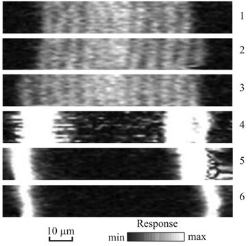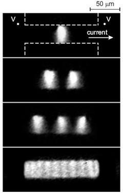 Збільшення кількості ЛПФ у тонкоплівковій смузці зі збільшенням струму та поширенням нормальної області. Температура становить 3.64K, а значення струму (в мА) для послідовних сканувань: 0.53 (1), 0.56 (2), 0.58 (3), 0.63 (4), 0.65 (5), 0.68 (6). Модуляція частоти променя становить 17.5кГц. Сірошкальні карти показують характеристику змінної напруги НТЛСМ. Найяскравіші області відповідають максимальній напрузі, а найтемніші — мінімальній (2мкВ) (0мкВ).
