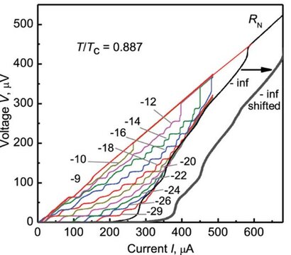 Рис.1 Набір кривих вольт-амперної залежності (ВАХ) біметалевого містку для різних потужностей мікрохвильового опромінення; частота опромінення становить 10ГГц. Вихідна потужність мікрохвильового випромінювання генератора вказана в дБм біля кожної кривої; «-inf» відповідає нульовій потужності. На кривій «-inf» видно три PSC. Крива «-inf» подвоєна та зміщена вбік для чіткішого огляду.