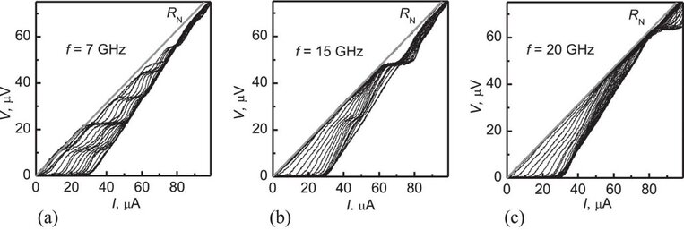 Рис.2 Набори кривих вольт-амперних залежностей (ВАХ) зі сходинками Шапіро для частоти опромінення: (a) 7, (b) 15 та (c) 20ГГц. Температура T = 3.63K, T/Tc = 0.992. На найвищій частоті присутня лише друга сходинка.