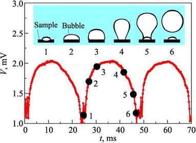 Рис.1 Еволюція бульбашок: постійна напруга на мікромості залежно від часу для кількох коливань при фіксованому струмі 7мА. Пронумеровані точки позначають різні стадії розвитку бульбашок пари на поверхні датчика. На вставці показано схематичну діаграму еволюції бульбашок пари.