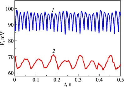 Рис.2 Різна орієнтація підкладки: постійна напруга на містку в залежності від часу для вертикальної (крива 1, струм 34.95мА) та горизонтальної (тонкоплівкова сторона детектора вниз) (крива 2, струм 32.9мА) орієнтації підкладки.